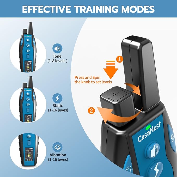 - Advanced Dog Training Collar: Exclusive dog shock collar with remote control design featuring Beep(1-8 levels), Vibration(1-16 levels) and Shock (1-16 levels) mode, so you could communicate with your furry friend in the most gentle and effective way possible.