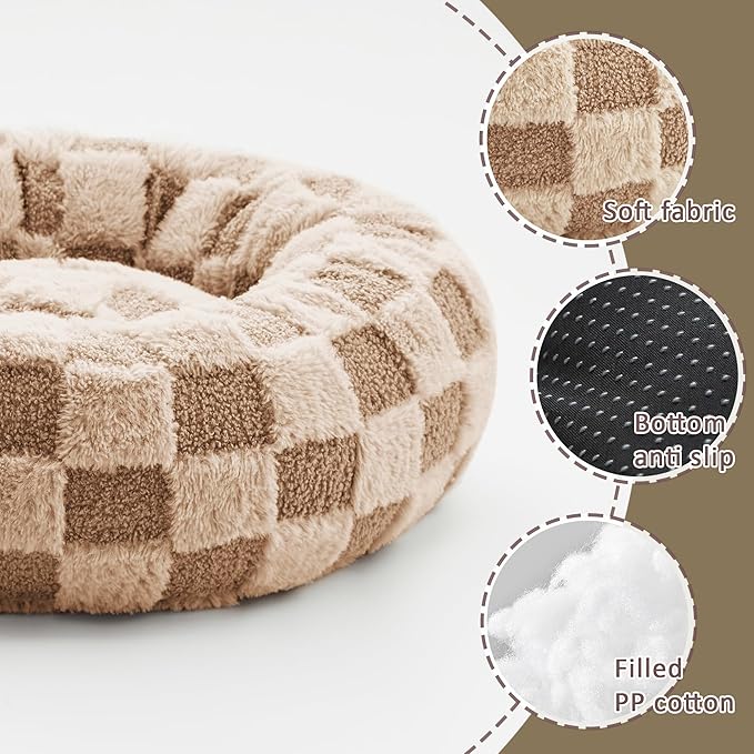 - Donut Cuddler Shape: The round dog bed allows pets to curl up while the raised rim creates a sense of security and provides head and neck support. Premium ultra-soft filling offers joint and muscle pain relief, is a great choice for elderly or sick dog pets. The 20 inch round pet bed is perfect for cat or puppy and other pets up to 15 lbs.