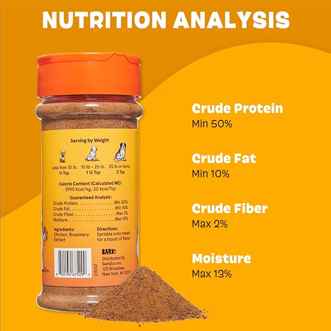 - Convenient Shaker Bottle for Effortless Application: Say goodbye to complex mealtime prep with BarkBox innovative shaker bottle. Designed for ultimate ease and convenience compared to wet toppers, the bottle ensures effortless application of the chicken topper onto your pup's kibble. With a straightforward shake, pour, and store design, you'll spend less time measuring and more time enjoying your dog's excitement during mealtime.