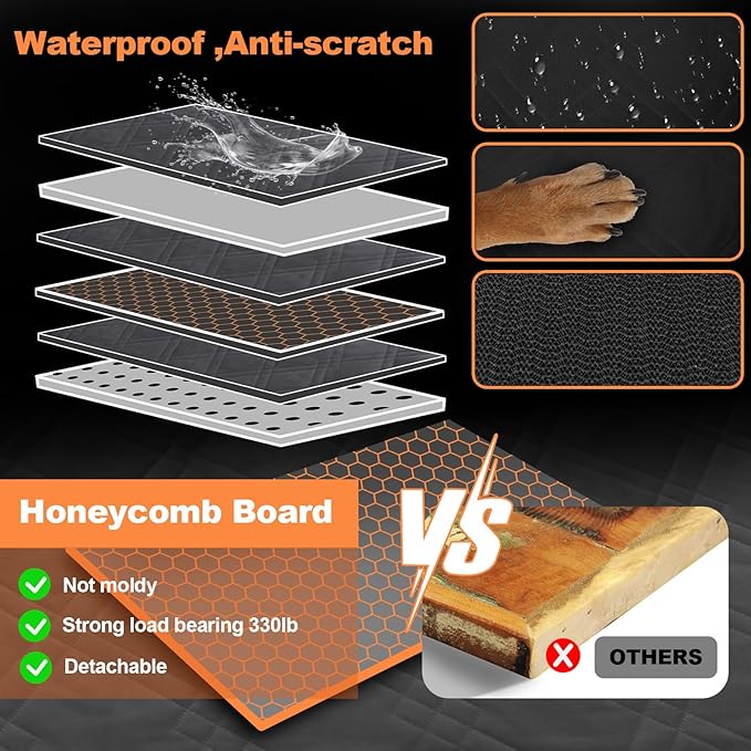 - Made of 600D oxford thick durable fabric, this back seat extender for dogs features 3 sturdy load-bearing Plates platforms provides your dogs with maximum space and strong support up to 280 lbs