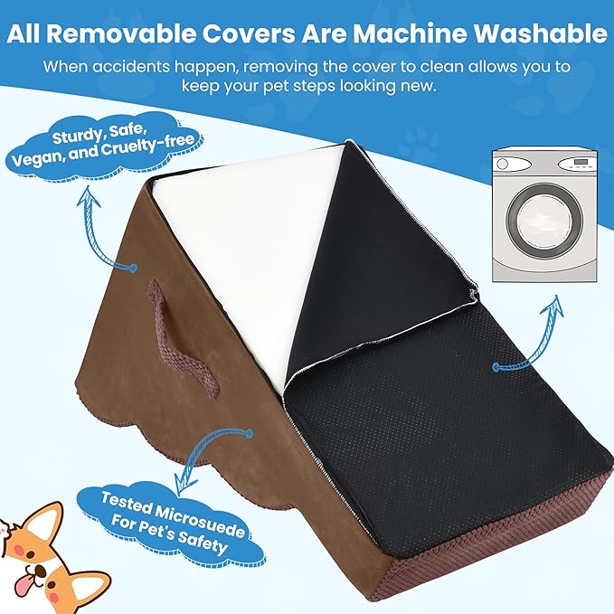 - REMOVABLE AND MACHINE WASHABLE COVER: Soft microsuede fabric is an upholstery grade fabric that is durable and suitable for pet traction and overall comfort when walking up and down stairs. With the removable dog stair cover, you can now easily remove any dirt or debris caused by paw prints! You can throw the dog stair cover in the washing machine or even use a second removable dog stair cover when cleaning the dirty one.