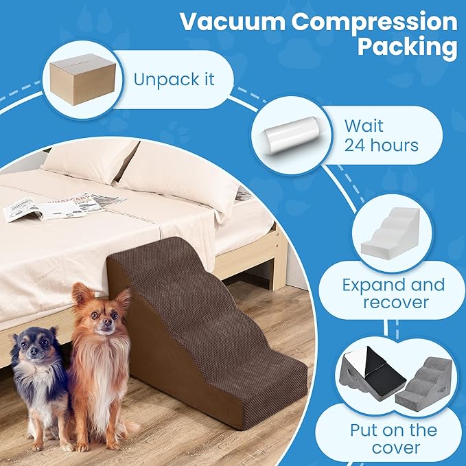 - Important note: Our dog stairs are vacuum-packed and need to sit for 24 hours after opening the memory foam package until the stairs are fully extended and covered with cloth covers.