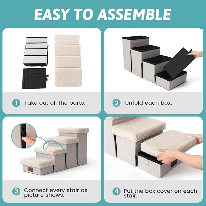 - 【Easy to Assemble】First you need to connect the zipper of each step, then open each step completely, Place each support board in the corresponding storage box, and finally cover it. When you don't need it, remove the cover and store it after it is completely folded. This saves your space and is suitable for small rooms. You can also watch our installation video in the product description below.