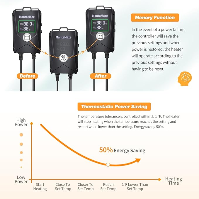 - 【Precise Control Temperatur】Temperature adjustable range: 63-94℉, hold the "+" and "-" for 5 seconds to switch between ℉ and ℃. Accuracy: ±1°F, the adjustable aquarium heater will stop heating when the temperature reaches the setting and restart when it is lower than the setting. The memory function can automatically retain the previous setting when the adjustable fish tank heater is restarted.