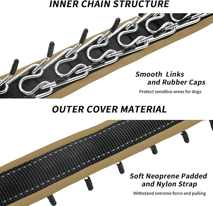 - 🐾【Strong & Durable Material】The inner chain of No Pull Dog Collar is made of stainless steel links, rust-proof and waterproof. Outer cover design with Full Surround Soft Neoprene Padded and Nylon Strap, which can withstand extreme force and pulling power. Combination of two layers adds extra safety to prevent Anti Pull Dog Collar from falling apart, more sturdy and durable.