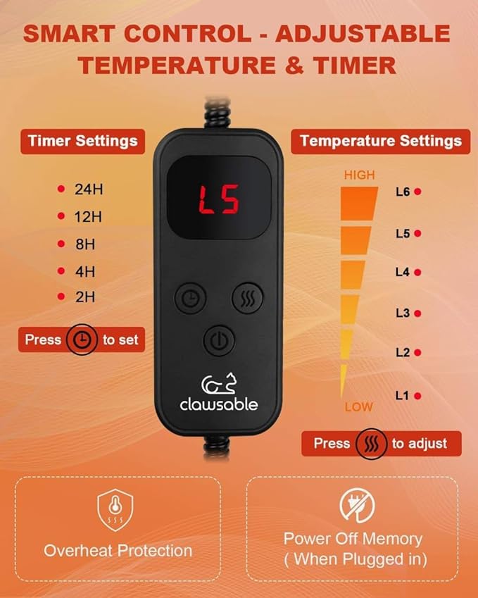 - 𝗦𝗺𝗮𝗿𝘁 𝗛𝗲𝗮𝘁𝗲𝗱 𝗣𝗮𝗱 𝘄𝗶𝘁𝗵 𝗧𝗶𝗺𝗲𝗿 - features a temperature regulator with 6 adjustable levels, ranging from 86 to 131℉/30 to 55℃. This dog heating blanket is equipped with a 5-level timer (2/4/8/12/24 H) that stops heating automatically when the timer concludes