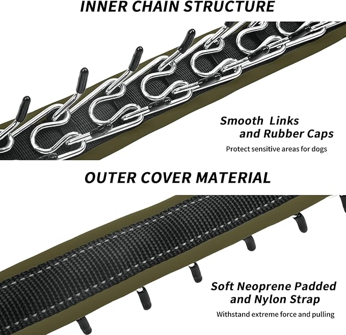 • 🐾【Strong & Durable Material】The inner chain of No Pull Dog Collar is made of stainless steel links, rust-proof and waterproof. Outer cover design with Full Surround Soft Neoprene Padded and Nylon Strap, which can withstand extreme force and pulling power. Combination of two layers adds extra safety to prevent Anti Pull Dog Collar from falling apart, more sturdy and durable.