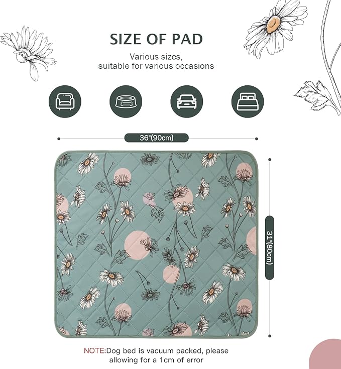 - 【Fashion and Non-slip】 Our daisy design makes this reusable pee pads for dogs very cute and makes your room more stylish. And the soft and comfortable puppy pee pads with anti-skid bottom can achieve a certain fixed effect.The bottom is waterproof and you can place it anywhere you want.