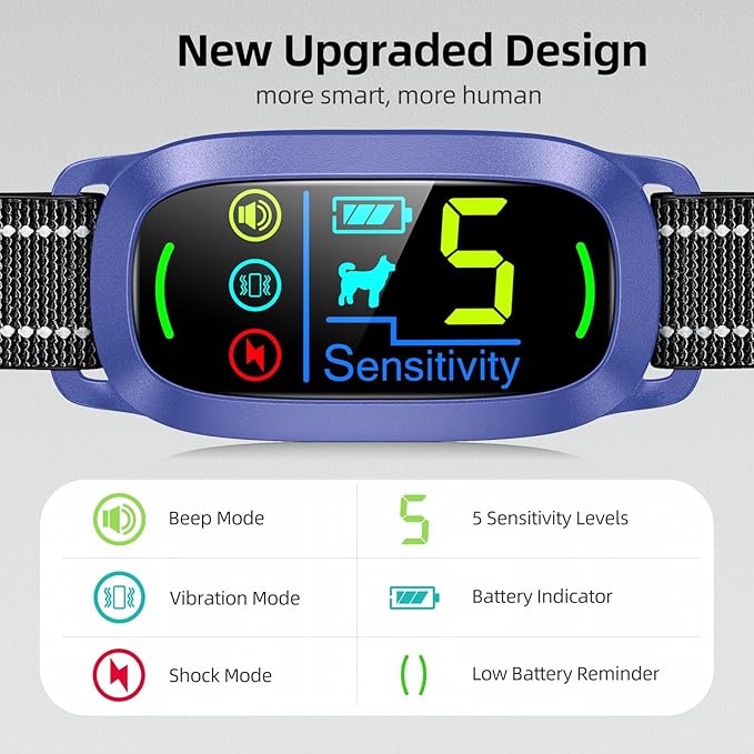 - Safer Humanized Setting: The dog bark collar has 4 working modes, no shock mode: beep, vibration, beep+vibration; Shock mode: beep+vibration+shock, 5 adjustable sensitivity levels; Just press the M button to switch the mode at will, you can enjoy quiet time