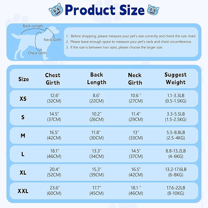 - 【Variety of Sizes】With six sizes ranging from XS to XXL, you can find the perfect fit for your small to medium-sized dog. Size L: Neck Girth is 14.5"; Chest Girth is 18.1"; Back Length is 13.3". Whether you have a tiny terrier or a robust bulldog, this shirt will ensure a snug and comfortable fit. Please measure your pet’s size before purchasing.