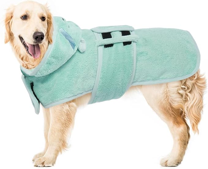 • CUTE DESIGN & VERSATILE USE: Dog bathrobe for drying dogs with belt, hoodie design, this dog towel wrap is poncho style; Bright colors make your pet look more cute; Get your pets dressed up as cool dinosaurs in cute robes with ears; Embrace the stylish way to care for your four-legged friend; It not only a adjustable microfiber bath robe, but also can be used as pajamas for dogs to keep warm in winter