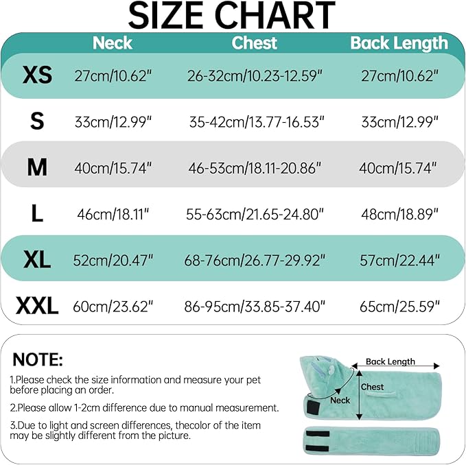 • SIZING FOR DOGS AND CATS: Multiple sizes are available for all types of pets, including kittens; Please measure the size of your pet before purchase, and then choose the right size according to the size chart and avoid being too big or small; If you have any questions about dog towel robe for drying dogs, please feel free to contact us, we will provide you with suitable solutions as soon as possible