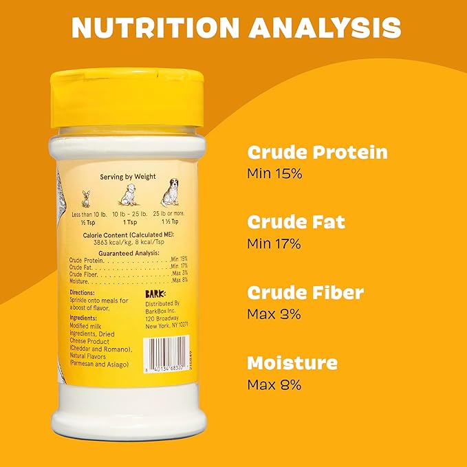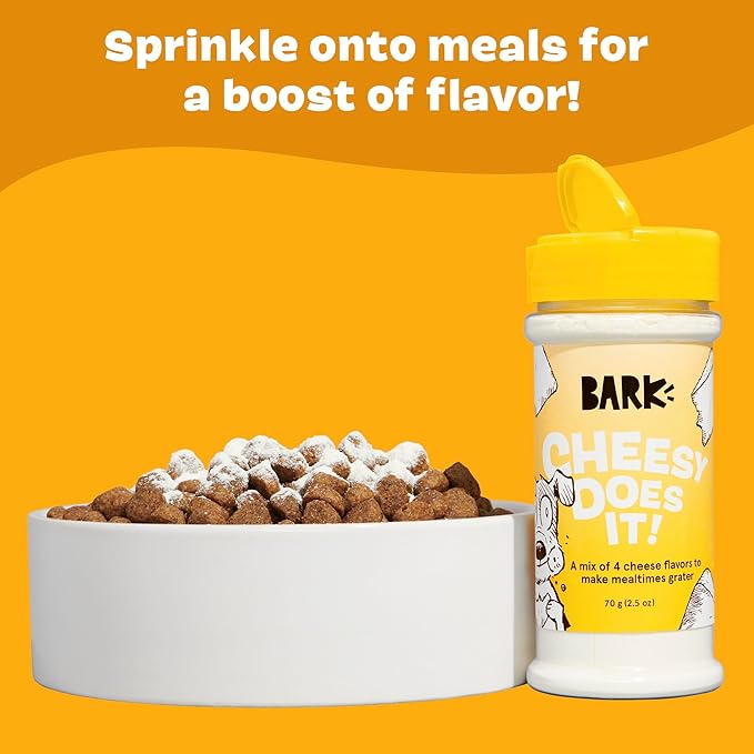 - Enhance Mealtime Magic with BarkBox Cheesy Toppers: Experience the enchantment of our limited-ingredient cheesy topper – a culinary wonder that transforms every meal into a disappearing act! Simply sprinkle generously over your dog's kibble and witness the magic unfold as every last bite vanishes. Each shake introduces a burst of our premium 4 cheese blend.