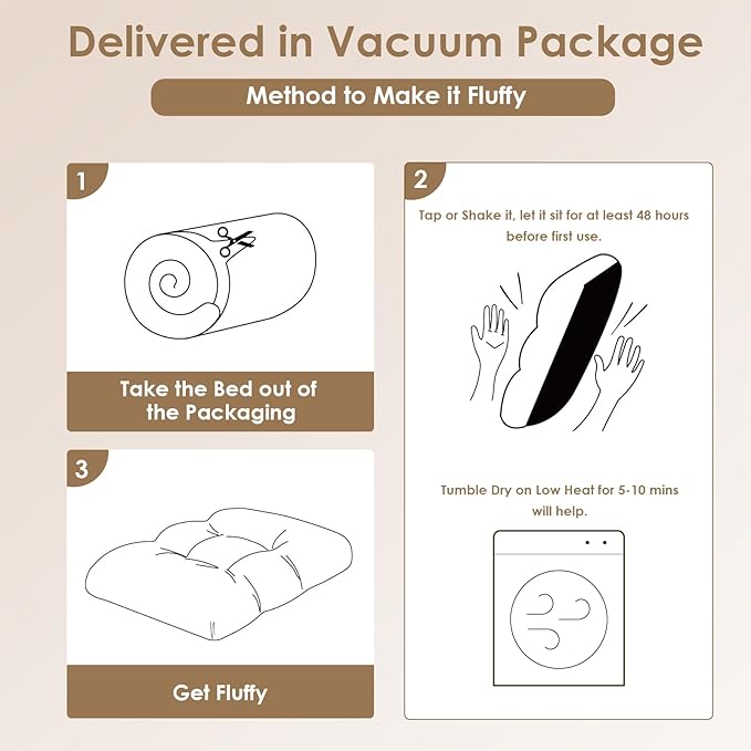 • MACHINE WASH and CARE INSTRUCTION - The washable dog bed can be put directly into the washing machine as a whole. This plush dog bed is vacuum-compressed, please remove the compression bag, shake it completely, and leave it for about 24 hours to expand. After washing and before use, please shake the bed back fluffy.