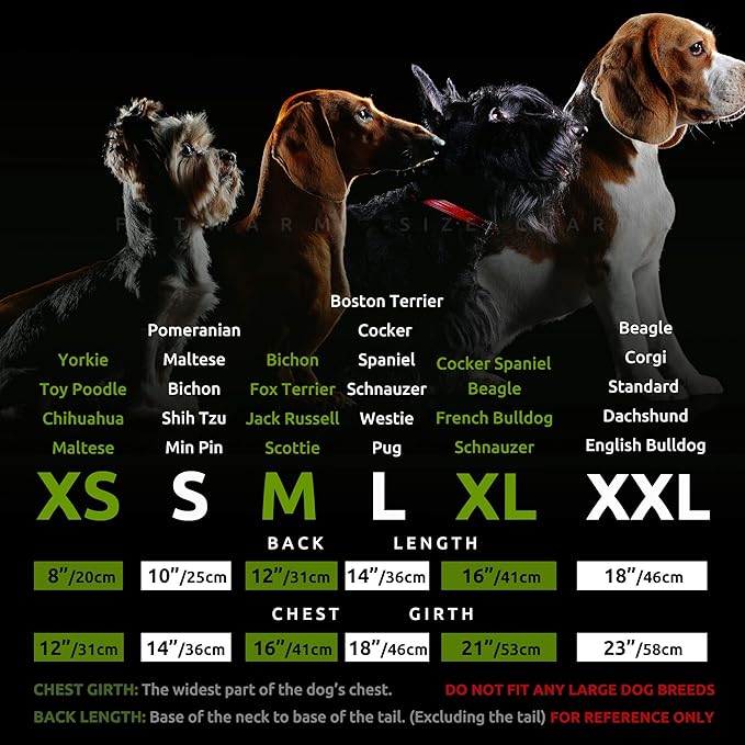 - FOR SMALL DOG BREEDS. Please priority follows the chest size. Size XSmall, fits 10" back, 12"chest. Recommended for: Chihuahua, Yorkshire Terrier, Toy Poodle, Maltese, Morkie, Pomeranian, Miniature Pinscher, tiny puppies and teacup breeds.
