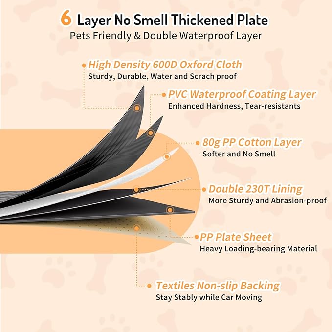 - 【6-layer Select Durable Material】 The back seat pet cover for dogs is made of 6 layers of high-quality material. The 600D density waterproof Oxford cloth is superior to other 3X2 density Oxford cloth on the market, making it more sturdy and scratch-resistant. The PVC coating is the second layer of waterproofing, and the double-layer waterproof effect is better than other single-layer waterproofing. The PP cotton layer above the removable bottom board increases softness. The bottom has non-slip rubber points to make the dog harness more secure and prevent the seat cushion from moving while driving.