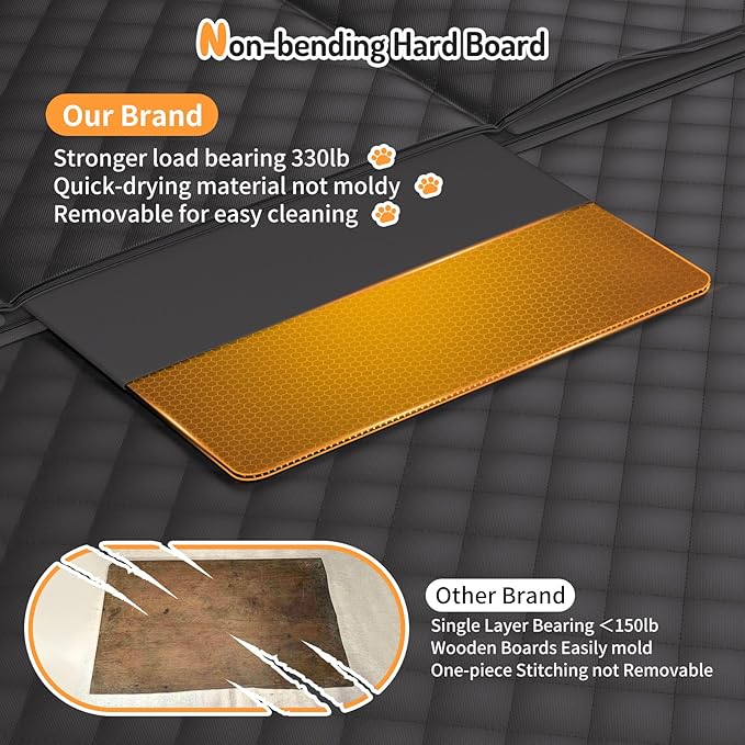 - 【330 Pound Weight-Bearing Hard Bottom】 The hard bottom car seat cover for dogs is more sturdy and stable than soft bottom dog car seat covers, with a weight-bearing capacity of up to 330 pounds (tested) and suitable for dogs of different breeds and sizes. This backseat cover has three detachable honeycomb thick hard bottom boards, much sturdier than thin and light wooden bottom boards on the market, and folds up to accommodate a child's safety seat.