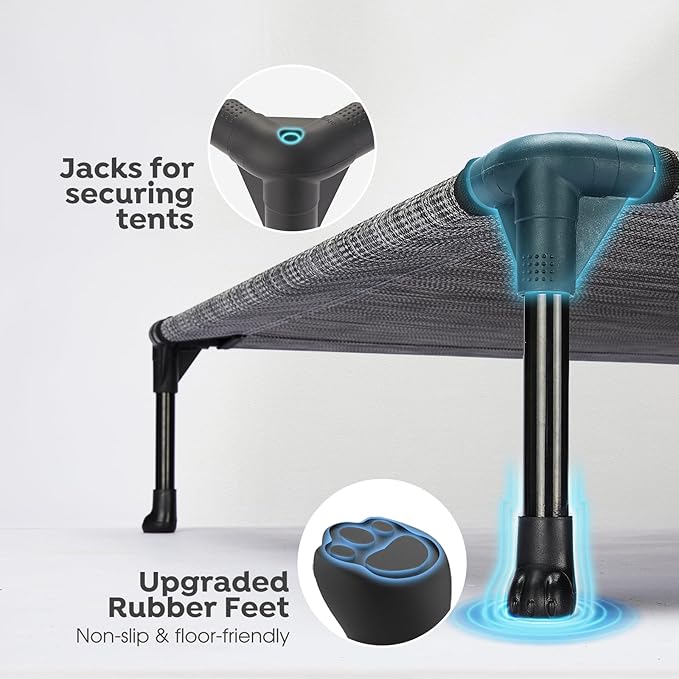 - Say Goodbye to Anxiety! Our dog cot is composed of powder-coated steel tube, durable textilene fabric, and non-skid rubber feet. Strong stability and high load-bearing capacity means saying goodbye to the fear of a sudden bed collapse.