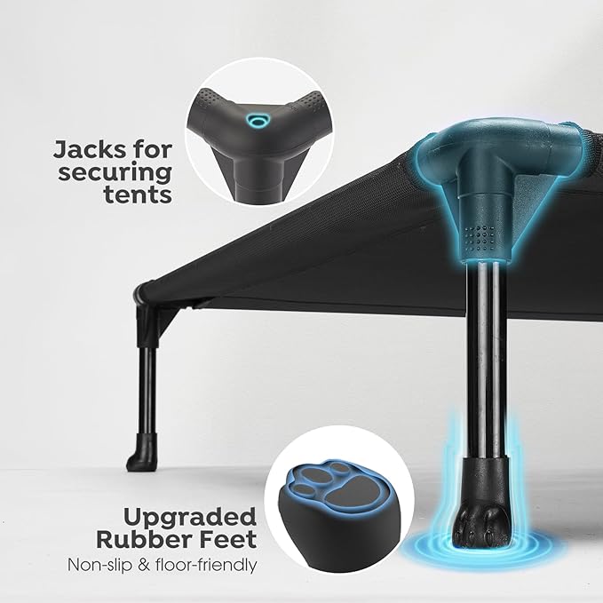 - Say Goodbye to Anxiety! Our dog cot is composed of powder-coated steel tube, durable textilene fabric, and non-skid rubber feet. Strong stability and high load-bearing capacity means saying goodbye to the fear of a sudden bed collapse.