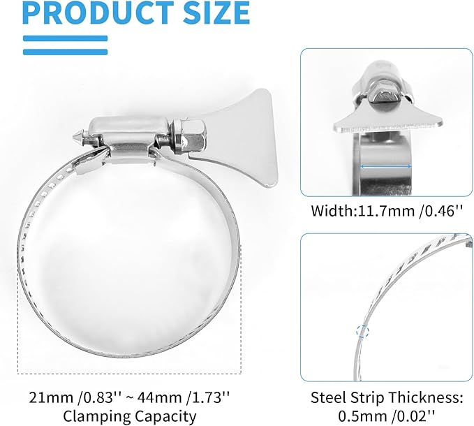 - 【Universal Compatibility】The metallic key-type hose clamps are designed for a wide applications, with a minimum diameter of 21 mm (0.83") and a maximum diameter of 44 mm (1.73"). These pool hose clamps are not only ideal for securing pool hoses but also for fuel lines, beer hoses, and more. Their adaptability makes them suitable for residential, automotive, marine, and industrial settings, where stainless steel hose clamps provide a reliable solution.