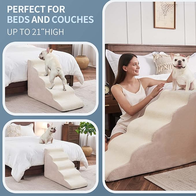 - COZY DOG STAIRS: Our foam dog stairs are designed to provide your dog friendly with a comfortable and safe way to reach their favorite spots. Our stairs are crafted to fit perfectly against the edge of a bed, sofa, or other furniture, ensuring easy and comfortable climbing. Suitable for cats of all sizes, our pet stairs provide a soft and supportive surface for your dog's paws. Give your furry friend the gift of comfort with our cozy cat stairs.