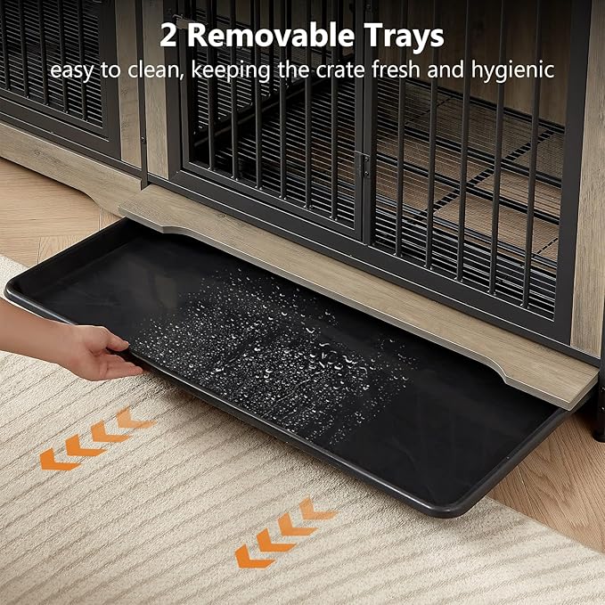 • 2 Concealed Trays - Our dog crate table is equipped with two washable trays discreetly located at the bottom, easily accessible by opening the hinge. This design not only enhances the aesthetic appeal with the wooden strips but also offers convenience for cleaning up pet hair and food.