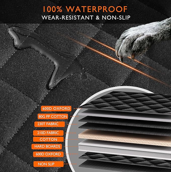 - 【𝗛𝗶𝗴𝗵-𝗤𝘂𝗮𝗹𝗶𝘁𝘆 𝗠𝗮𝘁𝗲𝗿𝗶𝗮𝗹𝘀】The dog car seat cover for back seat is waterproof and anti-scratch. The surface material is easy to clean after getting dirty, both hand wash and machine wash are available. Non-slip design at the backing is used, the dog car hammock is not easy to move, and the dog in the dog hammock for car is not easy to slide. The pet car seat is made of thicker, hard-wearing fabric, so it is more sturdy. High quality zipper is applied for sturdy use.