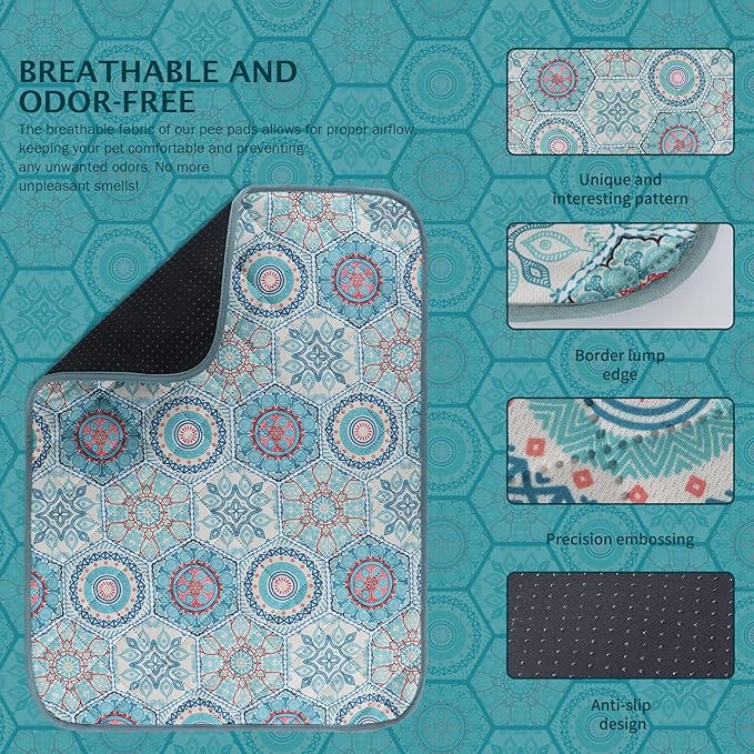 - 【Fashion and Non-slip】 Our medallion design makes this reusable pee pads for dogs very cute and makes your room more stylish. And the soft and comfortable puppy pee pads with anti-skid bottom can achieve a certain fixed effect.The bottom is waterproof and you can place it anywhere you want.