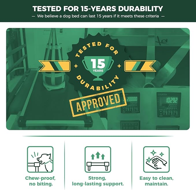 - We Make It: Our Titanest dog bed has been rigorously tested over 15 years by Société Générale de Surveillance S.A. (SGS), confirming its exceptional durability.