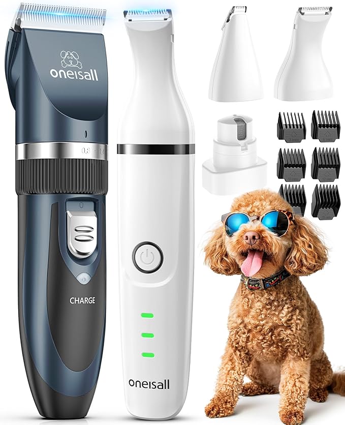 oneisall Dog Clippers and Dog Paw Trimmer Kit 2 in 1 Low Noise Cordless Dog Clippers for Grooming Pet Hair Trimmers for Small and Large Dogs Cats Animals