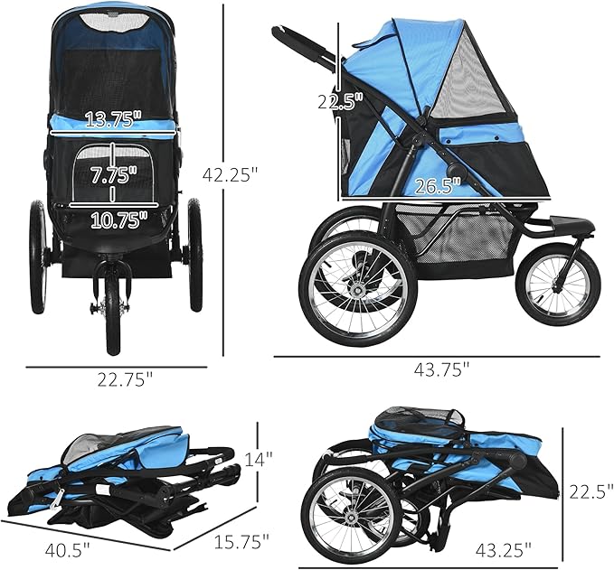 - Pet Stroller Specifications: The overall dimensions of the stroller are 43.75" L x 22.75" W x 42.25" H. The cabin dimensions with and without the canopy are 26.5" L x 13.75" W x 22.5" H and 9.75" H, respectively. When folded, the stroller measures 43.25" L x 22.75" W x 22.5" H, and with rear wheels removed, it measures 40.5" L x 15.75" W x 14" H. Assembly is required for setup.
