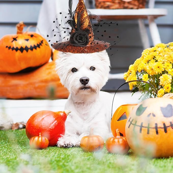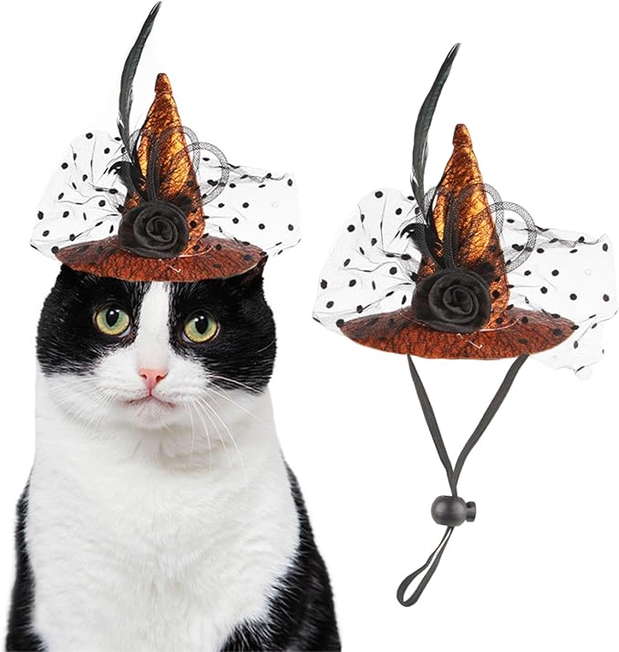 Halloween Pet Hat Adjustable Witch Hats for Cats Dogs Yellow Witch Hat Pet Headwear Black Lace Cosplay Costumes Adjustable Flower Hat for Small and Medium Cats Dogs