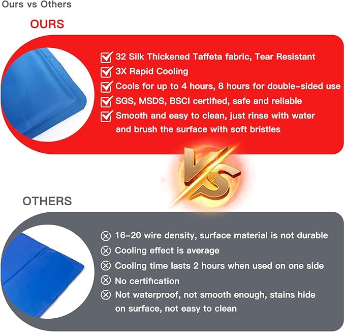 - 3x Faster Cooling: Dog cooling pad newly upgraded, increase 1.5 times the density, using 32 silk thickened taffeta composite PVC fabric. With SGS, MSDS, BSCI multiple testing certification, faster cooling, higher safety! A must-have gift for dogs to escape the summer heat!