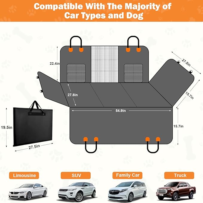 - 【Convenient】Mesh windows on both sides are equipped with anti-slip zippers, allowing interaction with your dog through the zippers. Enhanced and wider Velcro fasteners ensure sturdiness. Additionally, this dog rear seat extender features two large-capacity storage pockets for storing dog toys and treats. Suitable for most cars and mid-size SUVs: 53 inches long x 25 inches wide (hard bottom dimensions), easy to clean with a damp cloth or vacuum cleaner. The dog rear seat extender can be installed in seconds and comes with a carrying bag for storage.