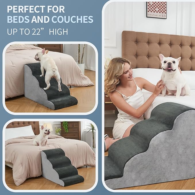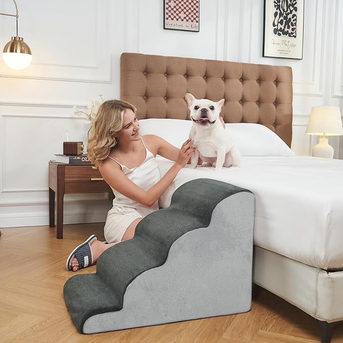 - COZY DOG STAIRS: Our foam dog stairs are designed to provide your dog friendly with a comfortable and safe way to reach their favorite spots. Our stairs are crafted to fit perfectly against the edge of a bed, sofa, or other furniture, ensuring easy and comfortable climbing. Suitable for cats of all sizes, our pet stairs provide a soft and supportive surface for your dog's paws. Give your furry friend the gift of comfort with our cozy cat stairs.