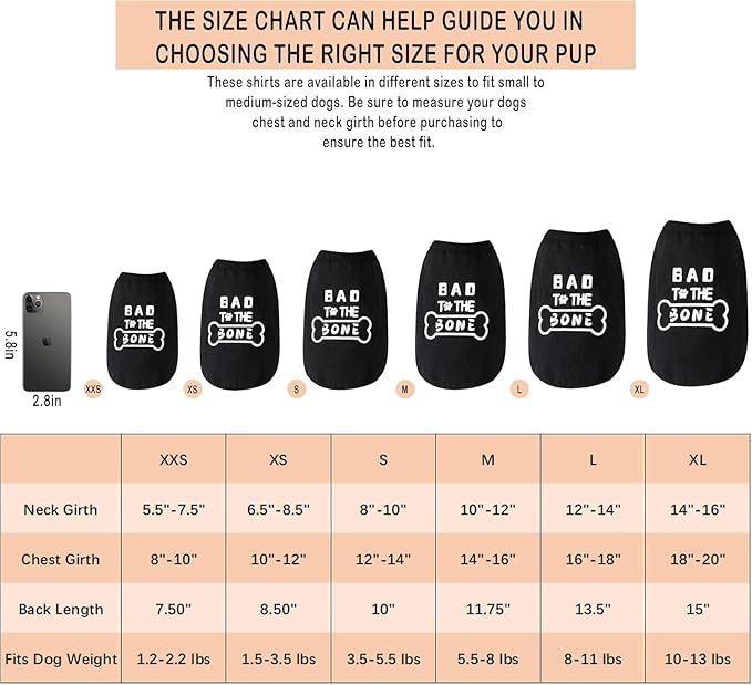 - Sizes: The shirt is available in different sizes to fit small to medium-sized dogs. Be sure to measure your dog's chest and neck girth before purchasing to ensure the best fit. The size chart can help guide you in choosing the right size for your pup.