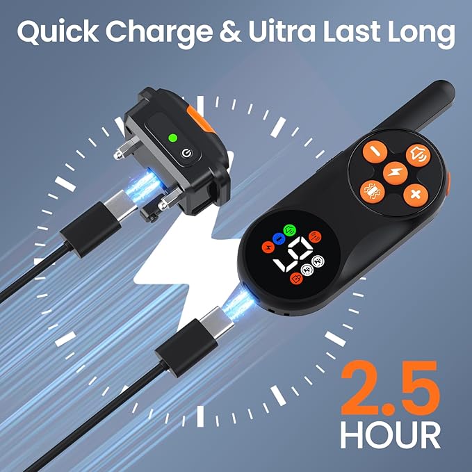 - Long-lasting Battery Life and Quick Charging: Say goodbye to frequent recharging as our dog training collar provides an incredible battery life. The e-collar can last up to 35 days on standby, while the remote lasts up to 45 days. Plus, quick charging ensures minimal downtime for uninterrupted training sessions.