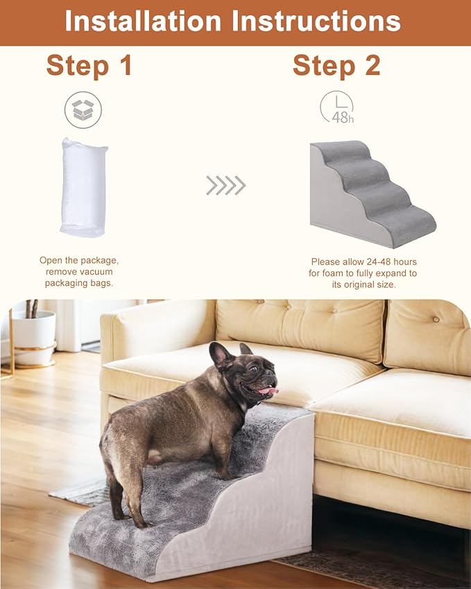 - 【Easy Assemblly】Our dog stair ramp is vacuum-compressed. After removing the foam from the compression bag, please allow 24-48 hours for the foam to rebound quickly into the shape of a staircase before use. Note:3-step and 4-step stairs are no assembly required,but 5-step stairs require simple assembly!