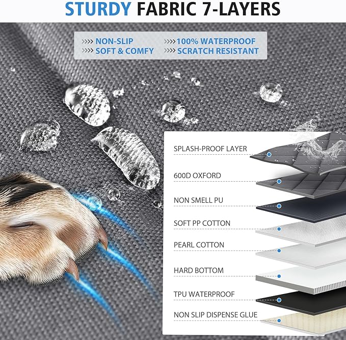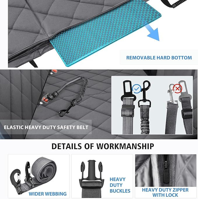 - 【Hard Bottom, Durable Material】 This hard bottom car seat cover for dogs is made of stronger but softer material. It is made of PU layer, which is flavorless and also waterproof. The surface is high-density firm Oxford cloth, more durable and easy to clean. Pearl cotton is sandwiched in the center, more soft. Thickened hollow board is more solid and not easy to bend. Encrypted and thickened webbing and lock buckle are more advanced and durable.