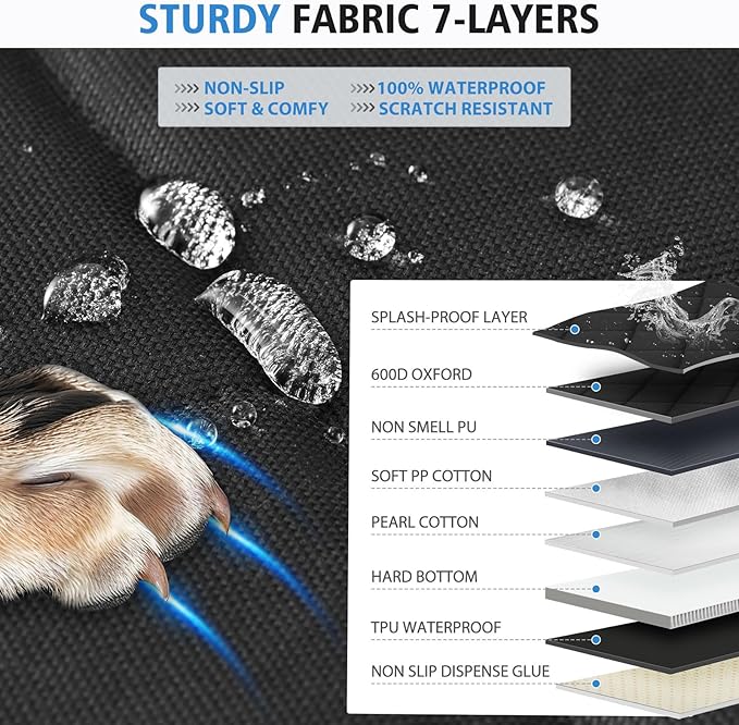 - 【Hard Bottom, Durable Material】 This hard bottom car seat cover for dogs is made of stronger but softer material. It is made of PU layer, which is flavorless and also waterproof. The surface is high-density firm Oxford cloth, more durable and easy to clean. Pearl cotton is sandwiched in the center, more soft. Thickened hollow board is more solid and not easy to bend. Encrypted and thickened webbing and lock buckle are more advanced and durable.