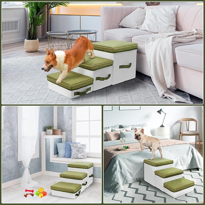 - 【Convenient Foldable Dog Stairs】Enjoy quick and hassle-free installation.The foldable design makes it convenient to store when not in use. Additionally, with extra storage space for each box for toys and snacks, It can also be folded into a basic dog bed for your furry puppy to sleep