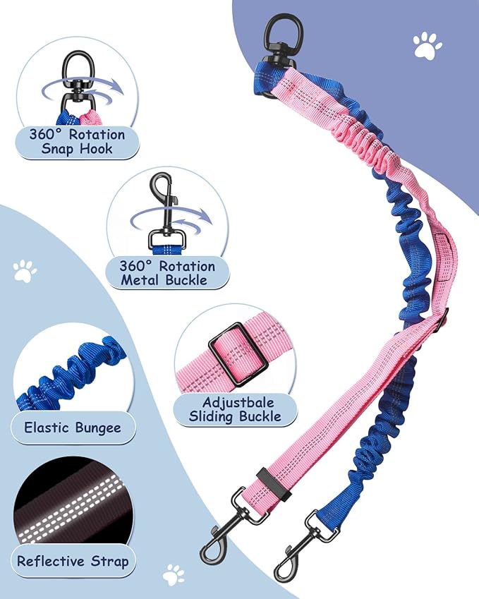 - 【Flexible & Shock Absorbing Bungee】- Vastar dog leash for 2 dogs comes with reinforced and stretchable bungee design that absorb shock of sudden moves and strong pulling when used with energetic and active dogs, reducing the pain of dragging dogs and owner.