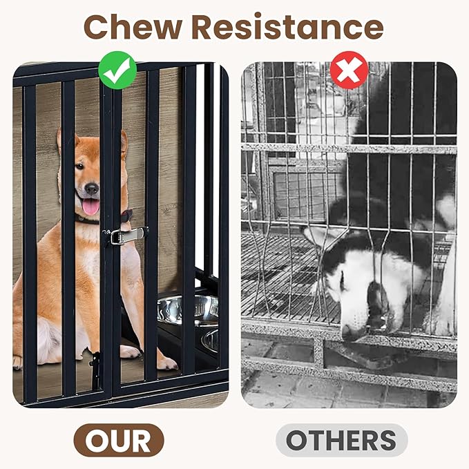 - Dog Crate Furniture - This indoor dog cage enhances your pet's living environment and features a particleboard top that provides additional storage space for snacks, toys, and other essentials. When the top door is opened, it transforms the table into a semi-open playpen.