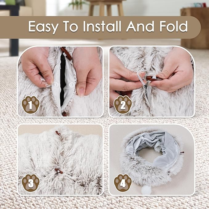 - Interactive Fun: The multi-functional design allows your pet to explore, chase, hunt, and play hide-and-seek freely in the cat play tunnel, and the hanging fur cat toy with balls in a circle at the exit add extra interactive fun, this cat tunnel will be your pet's dream playmate