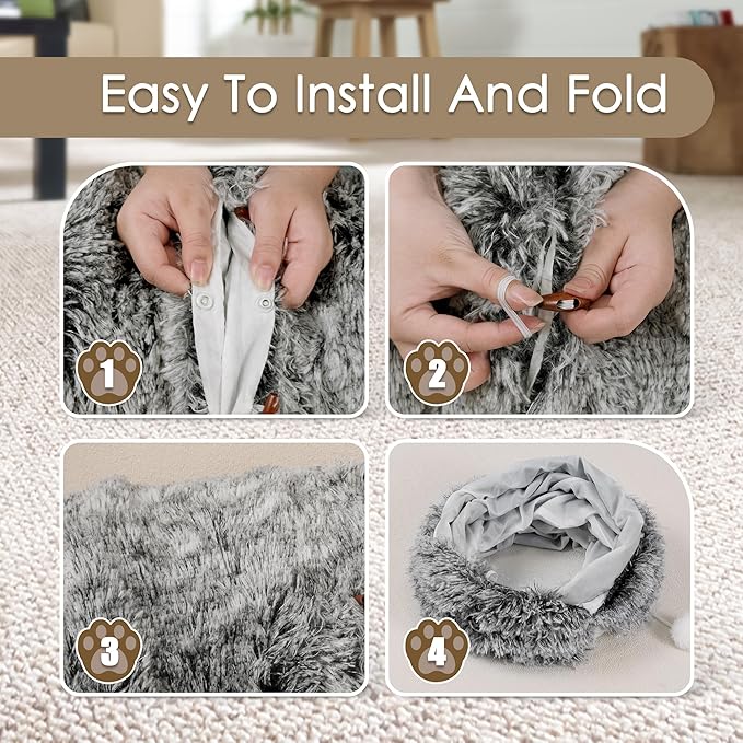 - Interactive Fun: The multi-functional design allows your pet to explore, chase, hunt, and play hide-and-seek freely in the cat play tunnel, and the hanging fur cat toy with balls in a circle at the exit add extra interactive fun, this cat tunnel will be your pet's dream playmate
