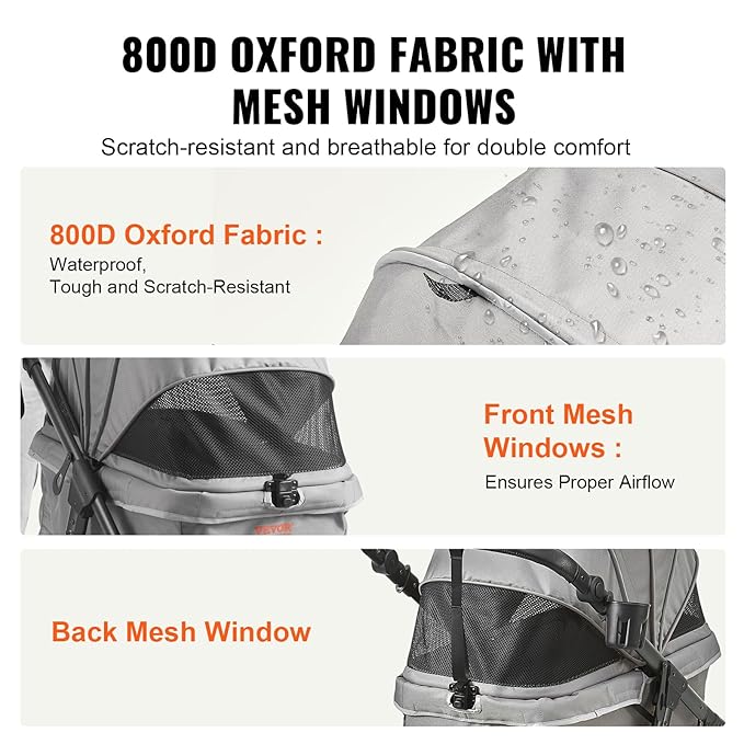 - DURABLE & STURDY MATERIAL: The structure of VEVOR pet stroller is made of superior aluminum alloy with rust-resistant powder coating, which is more durable and sturdy than normal steel frame. And this dog stroller is equipped with sturdy and water-resistant IMPROVED 800D oxford material, can withstand pet nibbling and keeping the cat stroller in pristine condition.