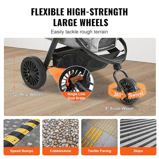 - FLEXIBLE HIGH-STRENGTH WHEELS: This pet stroller for dogs and cats is equipped with wear-resistant PU large wheels (9" front, 12" rear), The 360° swivel front wheels provide easy maneuvering, and the rear wheels' dual-brake system provides safety for you and your pet. Just a gentle step on the brakes, and both wheels lock.