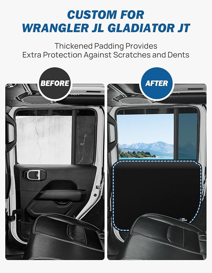 - Tailored Fit for Wrangler JL Gladiator JT: Designed specifically to match the contours of Wrangler rear doors, with added cushioning inside for additional protection against interior leather wear