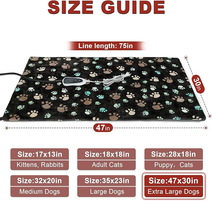 - UPGRADED CONFIGURATION:Extra Large Dog Heating Pad 47 x 30 inches (for adult extra large dog breeds, such as Central Asian Shepherd, Rambler, Newfoundland, Kennel Cousin, Caucasian, Greyhound, Labrador, etc.) With smart controller + built-in multiple thermostat sensors, reinforced power cord connection ports + protected wire rope for extra safety. Comes with a super soft cloth cover
