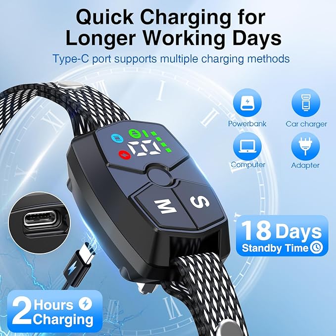 - 【Fast Charging & Long Battery Life】 This small dog bark collar charges fully in just 2 hours and lasts up to 18 days on standby, offering long-lasting use without frequent recharging. It's a practical choice for consistent training.